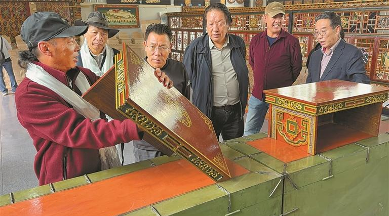 傳統藏式木雕彩繪作品。由西藏職業技術學院學生集體繪製的《吉祥八寶圖》。傳統藏式木雕彩繪(huì)作品。加措(左(zuǒ)一)為業內專家學者(zhě)介紹創新折疊式藏式(shì)家具。加措(cuò)和學生在石板上進行彩繪創作。2024年(nián),市民參觀“雪域...