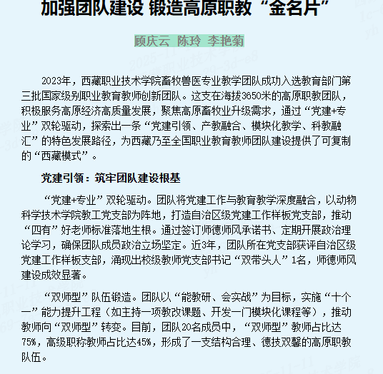 2023年(nián),西藏職業技術學院畜牧獸醫專業教學(xué)團隊成功入(rù)選教育部門第三批國家級(jí)別職業教育教師創新(xīn)團隊。這支在海拔3650米的高原職(zhí)教團隊,積極服務高原經濟高質量發展,聚焦高原畜牧業升級需求,通過(guò)“黨建+專業”...