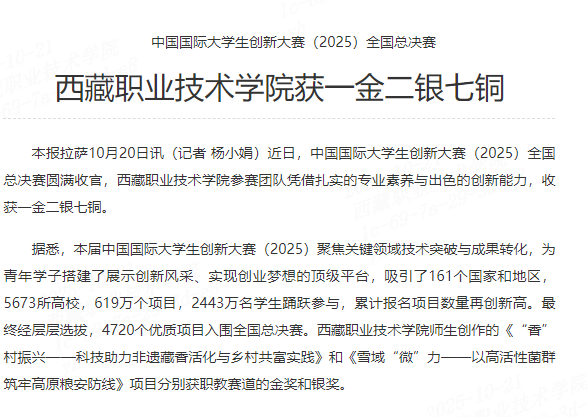 近日,中國國際大學生創新大賽(2025)全國總決賽(sài)圓滿收官,西藏職業技術學院參賽團隊斬獲(huò)一金二銀七銅,其中職教賽(sài)道喜獲一金一銀,“青年紅色築夢之旅”賽(sài)道再添一銀,創下學校在該項賽事中的(de)曆史最佳成績(jì)。這...