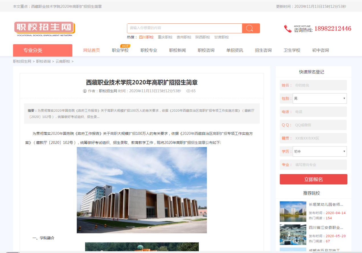 近(jìn)日,發現有個別網站發布關於西藏職業技術學院2020年高職擴招的招生信息,經核查,該信息(xī)發布渠道來源於《職校招生網》,有關網址(zhǐ)是:http://www.zzdxdis.com/plus/view.php?aid=294069&from=singlemessage,該...