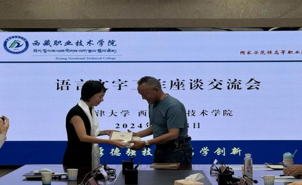 會上,呂靜同誌以天津大學國家通(tōng)用語言文字推廣基地申報情況(kuàng)、建設規劃為主題作交流發言;群培次仁同誌就(jiù)我院語言文字工作基本情況進行了(le)詳細介紹;雙方語言文字相關工作人員圍繞創意寫作、推普與專業融合、推普助力鄉村振(zhèn)興及經典誦讀活動等具體工作交流經驗,協商(shāng)合作方向。呂靜同(tóng)誌代表天津大學國家通用語言文字推廣(guǎng)基(jī)地向(xiàng)我院語言文字推廣基地贈書。