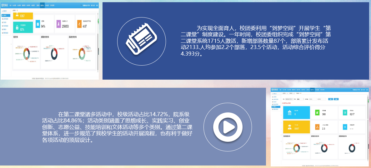 1.1.6黨建帶團建。堅持以黨建帶團建為目標,以優秀二級學(xué)院(yuàn)團總支和模範班級支部為抓手,推進班級團支部、二級學院團總支、學工處(團委)三級聯動;堅持發揮專職團幹(gàn)、兼職團幹、學生團幹和團員青年主動(dòng)性為基礎,明(míng)確“安排部署、對帳自查、評選處理、鞏(gǒng)固(gù)提升”工作思路。要(yào)求二級學院團總支組織運行機製到位、思想政治工作(zuò)到位、基層組織製度執行到位、服務青年成長成才工作到位、推動團學改革逐步到位,團(tuán)支部教育團員有力、管理團員有力、監督團員有力、組織青年有力、宣傳青年有力、凝聚青年有力、服務青年有(yǒu)力(lì),切實做到抓重點、補短板(bǎn)、攻弱項。