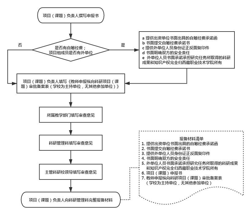 1.學校為主持(chí)單位,無其他參加單位,我(wǒ)校教師為項目(課(kè)題)負責人的縱向科研項目(mù)(課題)審批備案流程